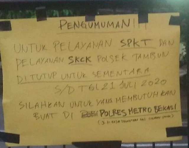 Berdasar pada tulisan pada karton cokelat yang tertempel di pintu gerbang Polsek Tambun, diketahui bahwa pelayanan SPTK dan SKCK Polsek Tambun ditutup sementara sampai dengan tanggal 21 Juli 2020, dan layanan dilaihkan ke Polres Metro Bekasi.