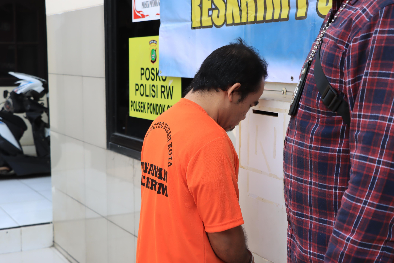 Kronologis penangkapannya menurut Kapolsek. Pelaku diamankan oleh warga dan diserahkan ke Polsek pondokgede berikut dengan barang buktinya, 1(satu) buah senjata tajam jenis pisau dengan sarung kulit berwarna coklat, 1(satu) buah kemeja lengan panjang krem, 1 (satu) buah celana panjang warna hijau dengan motif Kotak-kotak.